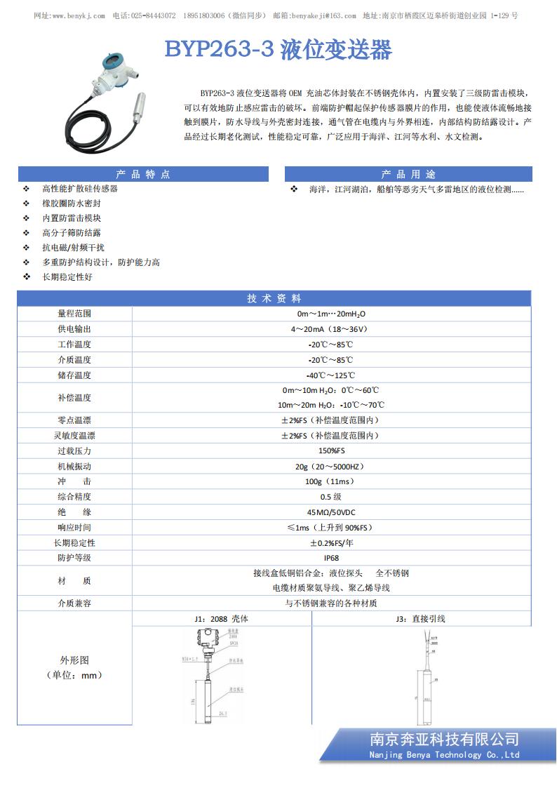 BYP263-3 液位变送器将 OEM 充油芯体封装在不锈钢壳体内,内置安装了三级防雷击模块,