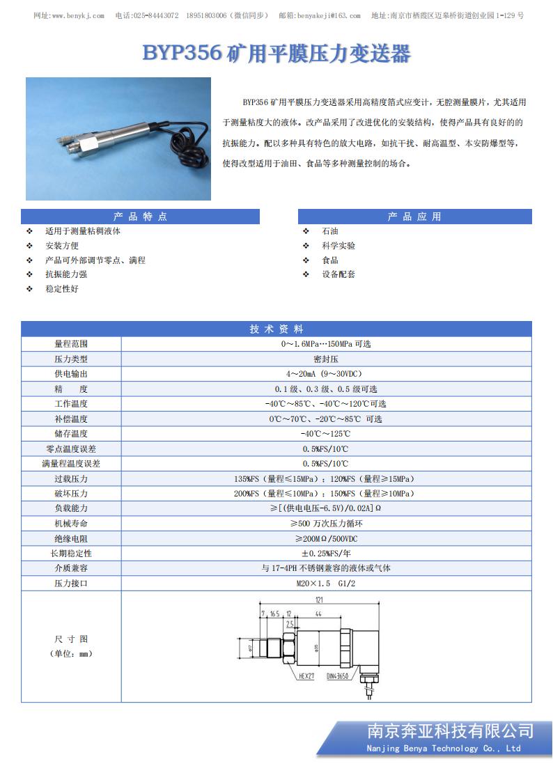 BYP356 矿用平膜压力变送器采用高精度箔式应变计,无腔测量膜片,尤其适用于测量粘度大的液体。改产品采用了改进优化的安装结构,使得产品具有良好的的抗振能力。配以多种具有特色的放大电路,如抗干扰、耐高温型、本安防爆型等,使得改型适用于油田、食品等多种测量控制的场合。