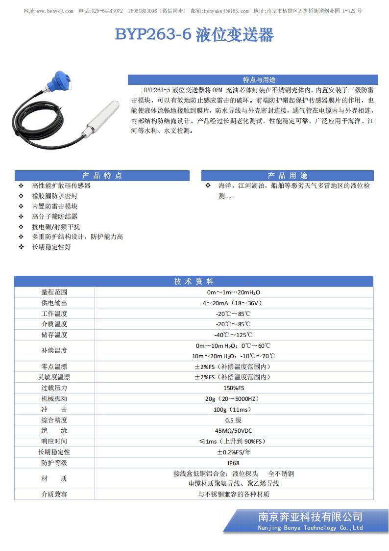 BYP263-5 液位变送器将 OEM 充油芯体封装在不锈钢壳体内,内置安装了三级防雷击模块,可以有效地防止感应雷击的破坏。前端防护帽起保护传感器膜片的作用,也能使液体流畅地接触到膜片,防水导线与外壳密封连接,通气管在电缆内与外界相连,内部结构防结露设计。产品经过长期老化测试,性能稳定可靠,广泛应用于海洋、江河等水利、水文检测。