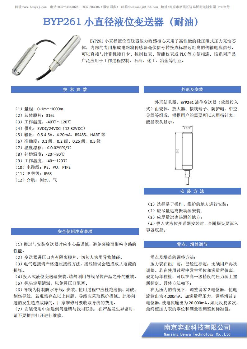BYP261 小直径液位变送器压力敏感核心采用了高性能的硅压阻式压力充油芯体,内部的专用集成电路将传感器毫伏信号转换成标准远距离的传输电流信号,可以直接与计算机接口卡、控制仪表、智能仪表或 PLC 等方便相连。该系列产品广泛应用于工作过程控制、石油、化工、冶金等行业。
