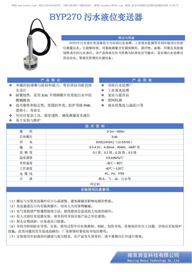 BYP270 污水液位变送器是专为市政污水处理、工业废水监测等苛刻环境设计的液位测量仪表。它能够持续、可靠地测量含有固体颗粒、悬浮物、油脂、纤维及其他腐蚀性成分的污水液位。该产品将液位信号转换为标准电信号输出,是实现污水处理过程自动化、智能化管理的关键设备。