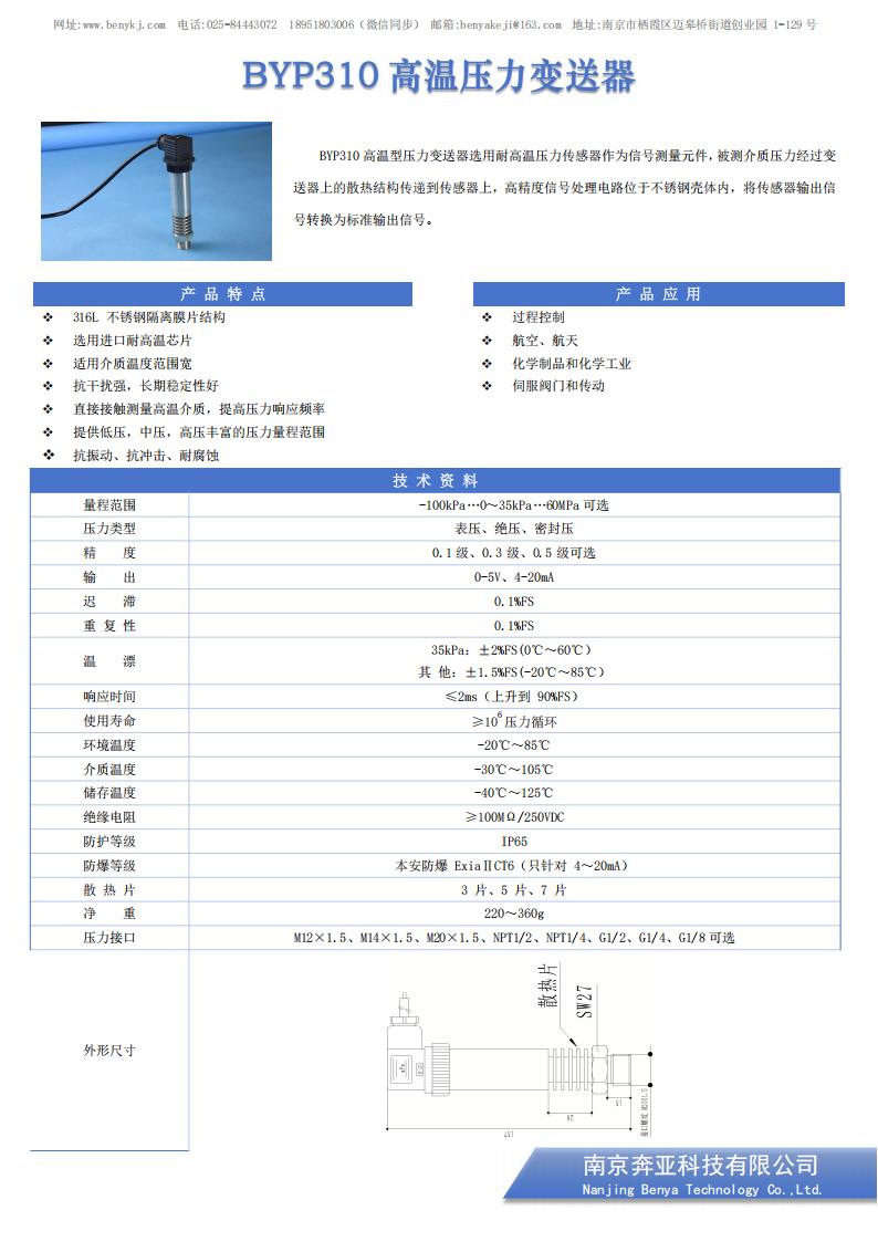 BYP310 高温型压力变送器选用耐高温压力传感器作为信号测量元件,被测介质压力经过变送器上的散热结构传递到传感器上,高精度信号处理电路位于不锈钢壳体内,将传感器输出信 号转换为标准输出信号。