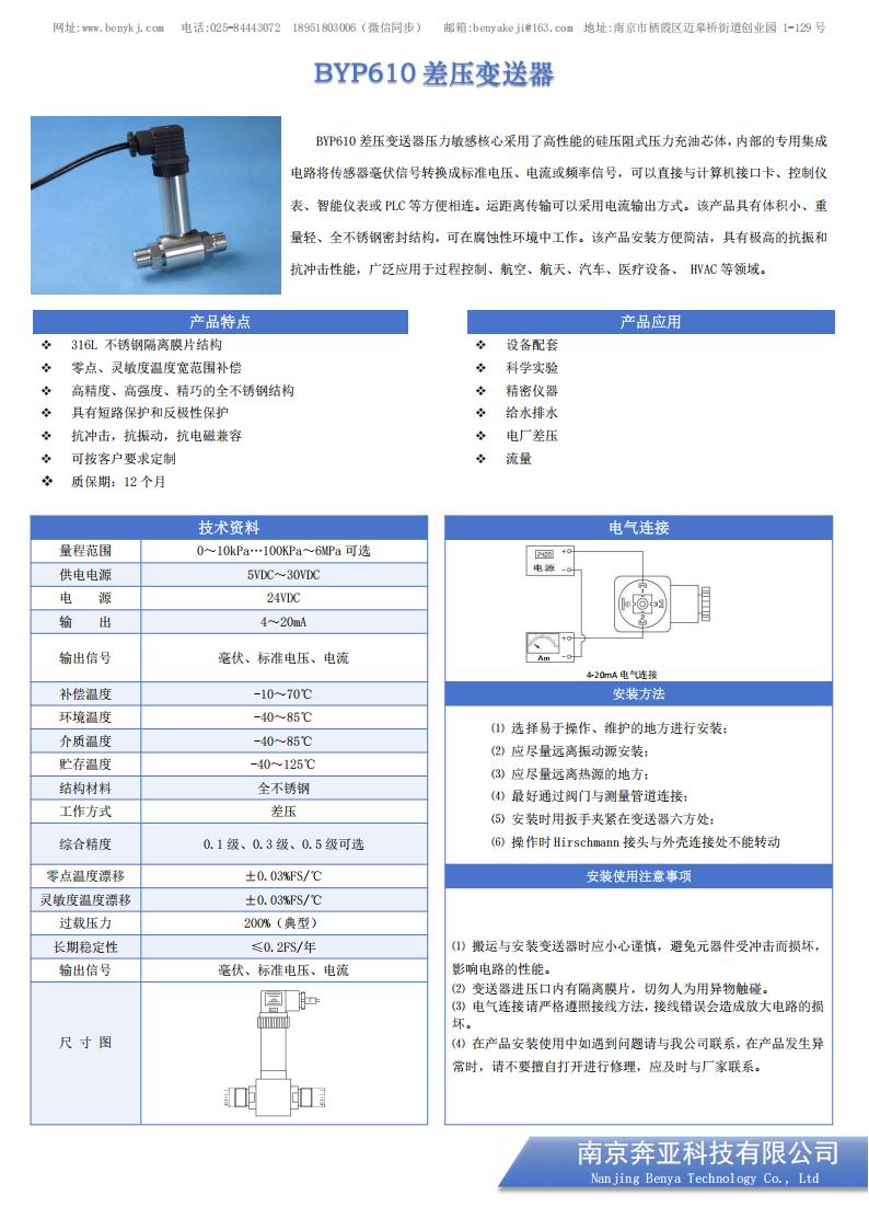 BYP610 差压变送器压力敏感核心采用了高性能的硅压阻式压力充油芯体,内部的专用集成电路将传感器毫伏信号转换成标准电压、电流或频率信号,可以直接与计算机接口卡、控制仪表、智能仪表或 PLC 等方便相连。运距离传输可以采用电流输出方式。该产品具有体积小、重量轻、全不锈钢密封结构,可在腐蚀性环境中工作。该产品安装方便简洁,具有极高的抗振和抗冲击性能,广泛应用于过程控制、航空、航天、汽车、医疗设备、 HVAC 等领域。